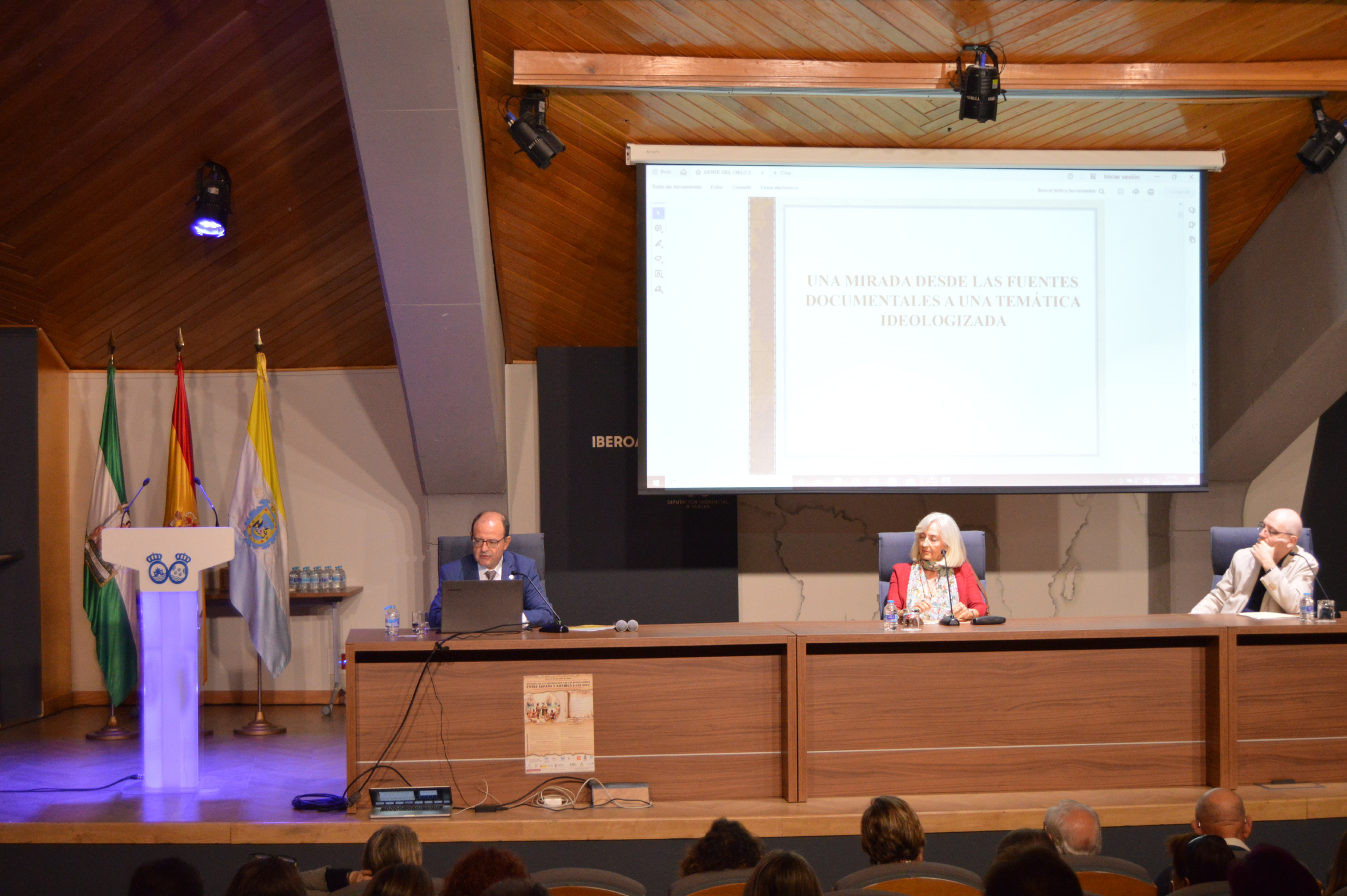 Seguidamente el catedrático de Historia Moderna de la UHU David González Cruz ha ofrecido la conferencia “Gente del cielo y nativos americanos: comunicación e intercambios durante la primera expedición colombina”. Una ponencia que establece diferencias sustanciales entre el descubrimiento de América y el proceso de conquista. Deja constancia que los Reyes Católicos desde un principio dieron instrucciones a Colón para que protegiera y evangelizara a los indígenas instándole promocionar las relaciones mutuas entre los descubridores y la población nativa. Los indígenas participaron en unos intercambios de productos dentro de un ambiente cordial en el que los miembros de la tripulación del primer viaje colombino eran considerados “gente del Cielo”. Asimismo, ha profundizado en la labor que realizaron los nativos como intérpretes de las lenguas americanas e informantes en la exploración de nuevos territorios.