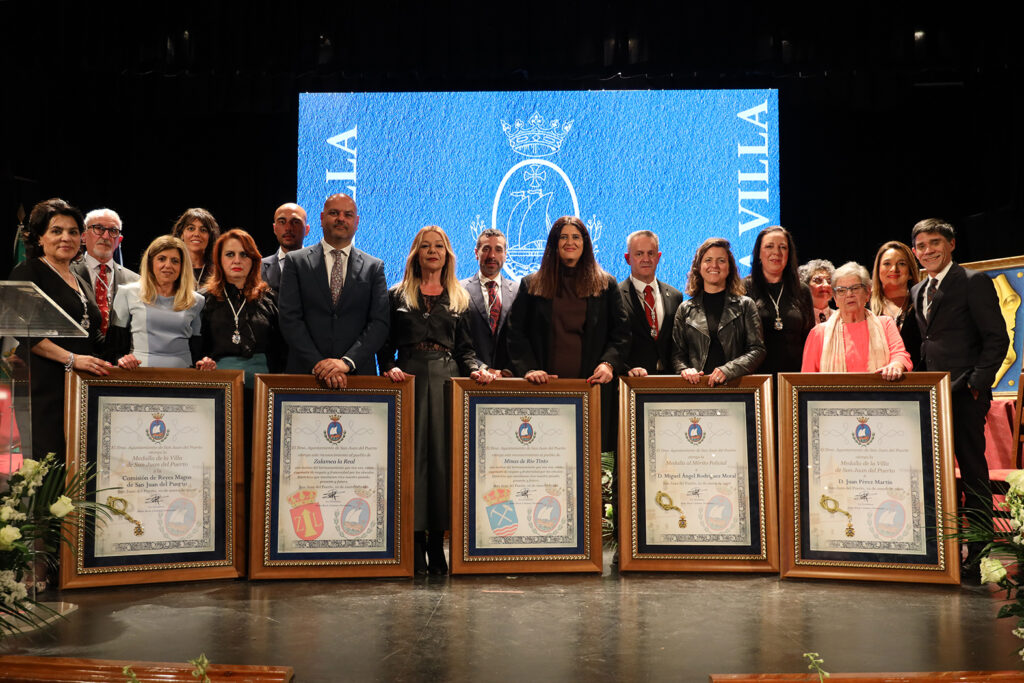 Respecto a las distinciones, el Ayuntamiento hizo entrega de la Medalla de la Villa a título póstumo a Juan Pérez Martín en reconocimiento a toda una vida de servicio público y compromiso con la cultura y desarrollo social de San Juan del Puerto. Empleado municipal desde muy joven y hasta su jubilación, fue una figura muy querida y cercana a la ciudadanía destacando por su vocación de ayuda, su implicación en la vida cultural y su papel fundamental en la conmemoración del V Centenario de la fundación del municipio. Su legado permanece ligado al impulso de las tradiciones locales, la promoción cultural y el fomento de la participación ciudadana. En representación de la familia fue recibida por su hija Mª Ángeles Pérez Beltrán.