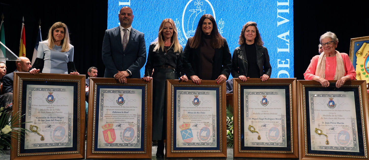 Respecto a las distinciones, el Ayuntamiento hizo entrega de la Medalla de la Villa a título póstumo a Juan Pérez Martín en reconocimiento a toda una vida de servicio público y compromiso con la cultura y desarrollo social de San Juan del Puerto. Empleado municipal desde muy joven y hasta su jubilación, fue una figura muy querida y cercana a la ciudadanía destacando por su vocación de ayuda, su implicación en la vida cultural y su papel fundamental en la conmemoración del V Centenario de la fundación del municipio. Su legado permanece ligado al impulso de las tradiciones locales, la promoción cultural y el fomento de la participación ciudadana. En representación de la familia fue recibida por su hija Mª Ángeles Pérez Beltrán.