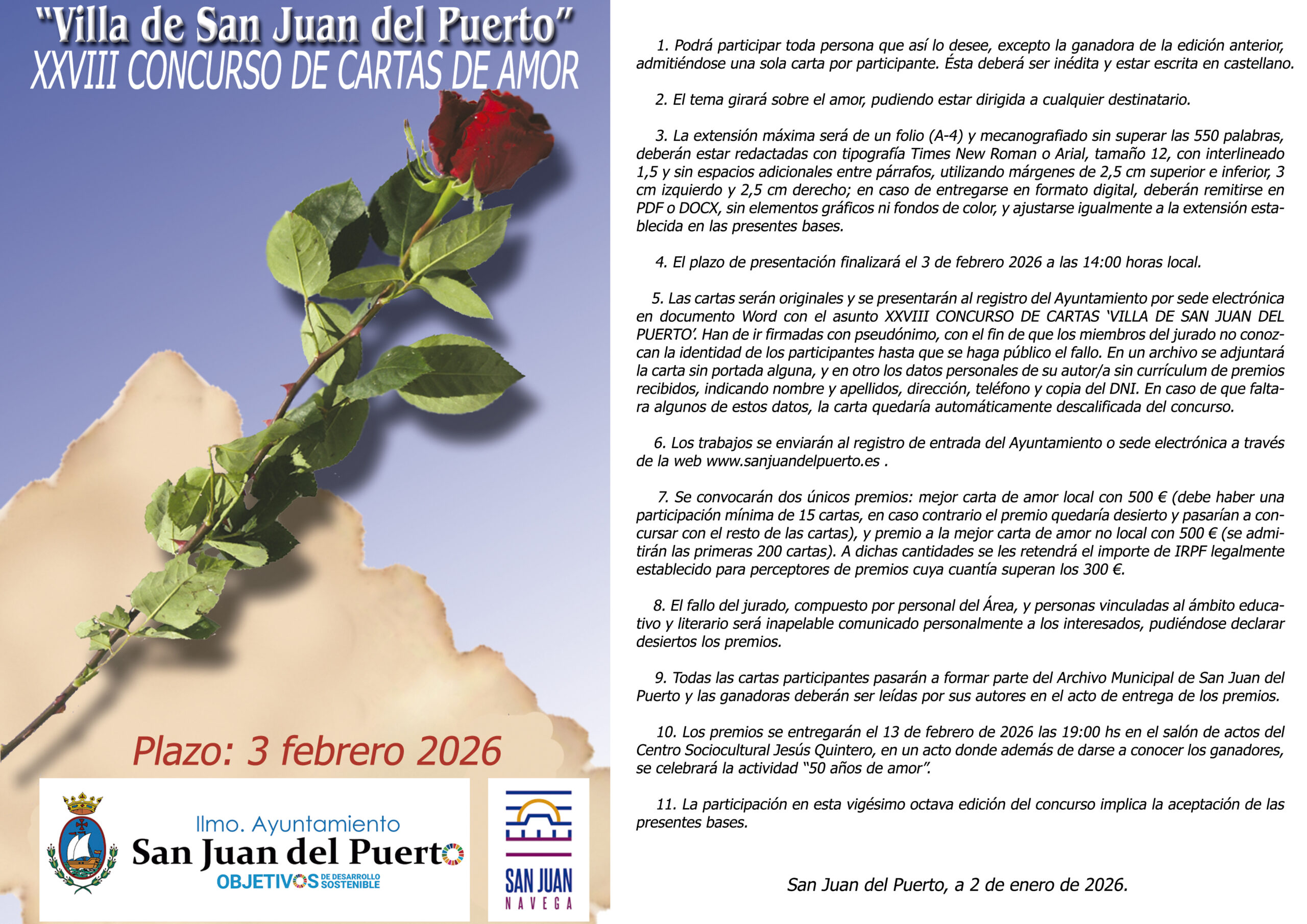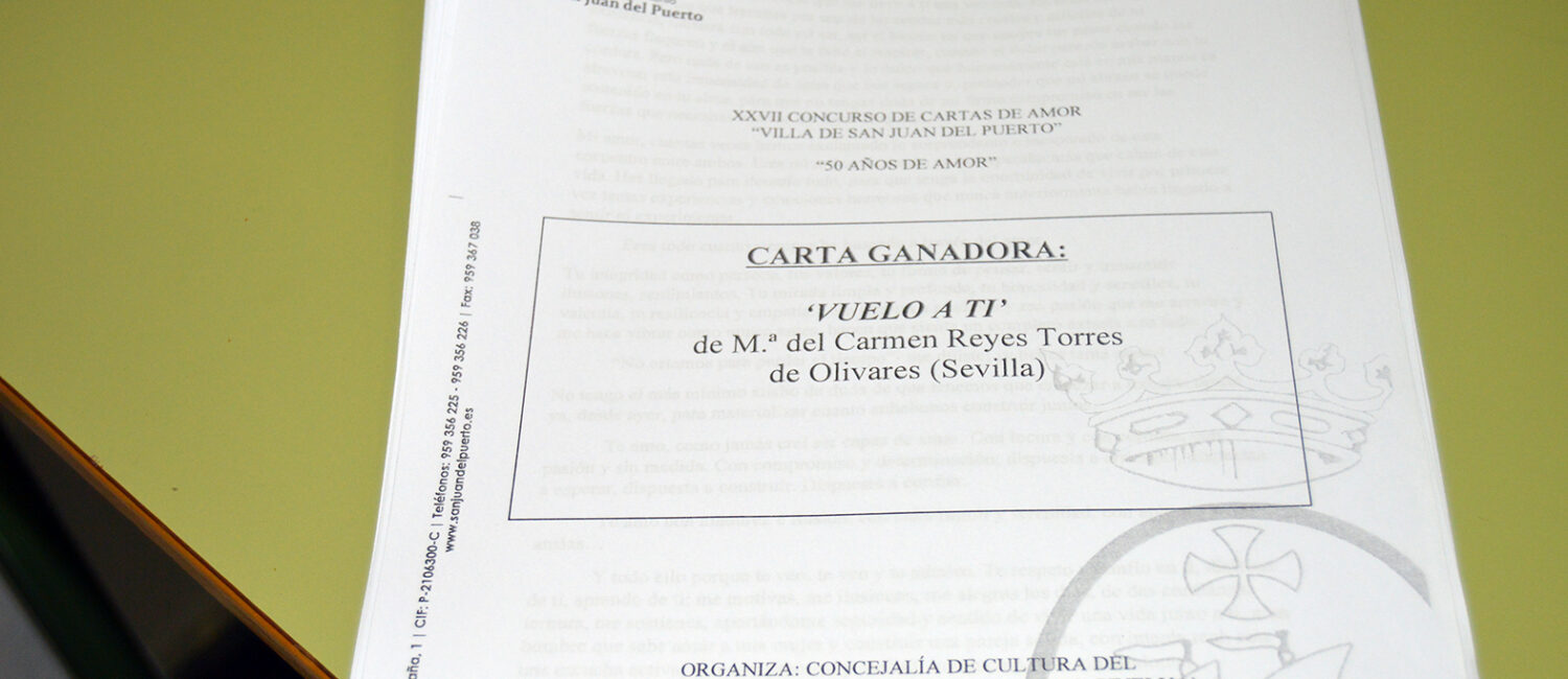 El Ayuntamiento de San Juan del Puerto ha convocado el XXVIII Concurso de Cartas de Amor “Villa de San Juan del Puerto”, una cita ya consolidada dentro del calendario cultural del municipio y que cada año invita a reflexionar y escribir sobre el amor desde cualquier perspectiva y destinatario.